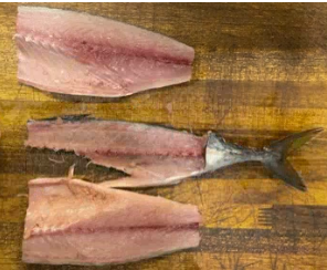 고등어 손질의 경우 머리의 옆에 있는 지느러미와 배 쪽 지느러미를 사선으로 칼을 넣습니다.