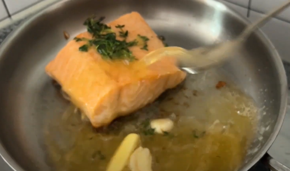 프라이팬을 기울이고 고등어에 기름을 끼얹어 줍니다. (베이 스팅)