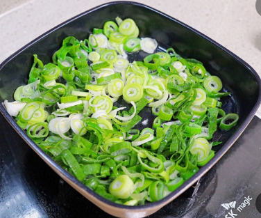 - 1. 먼저 식용유를 두르고 대파 , 스팸을 넣고 약불에서 구워줍니다.