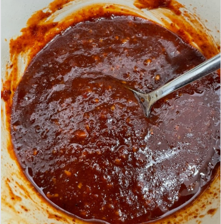 그래서 물엿 설탕 매실청으로 달달하면서도 감칠맛과 산미를 넣어주고 거기에 간장과 고운고춧가루를 넣어서 짠맛과 매운맛 그리고 농도를 더했습니다. 마늘과 고추를 통해 매운맛과 풍미를 그리고 마지막으로 핵심인 볶은 검은콩 가루를 넣었습니다.