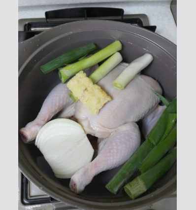 - 냄비에 닭을 담고 분량의 물을 붓는다. 처음에는 센 불에서 한소끔 끓인 뒤 불을 줄여 푹 무르도록 뭉근하게 40분 정도 끓인다.
