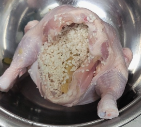 - 닭 뱃속에 찹쌀을 먼저 넣은 뒤 손질한 수삼, 밤, 대추, 잣, 은행, 마늘을 채워 넣는다. 부재료가 빠져 나오지 않게 꼬치나 실로 꿰메거나 다리를 서로 엇갈리게 꼰다.