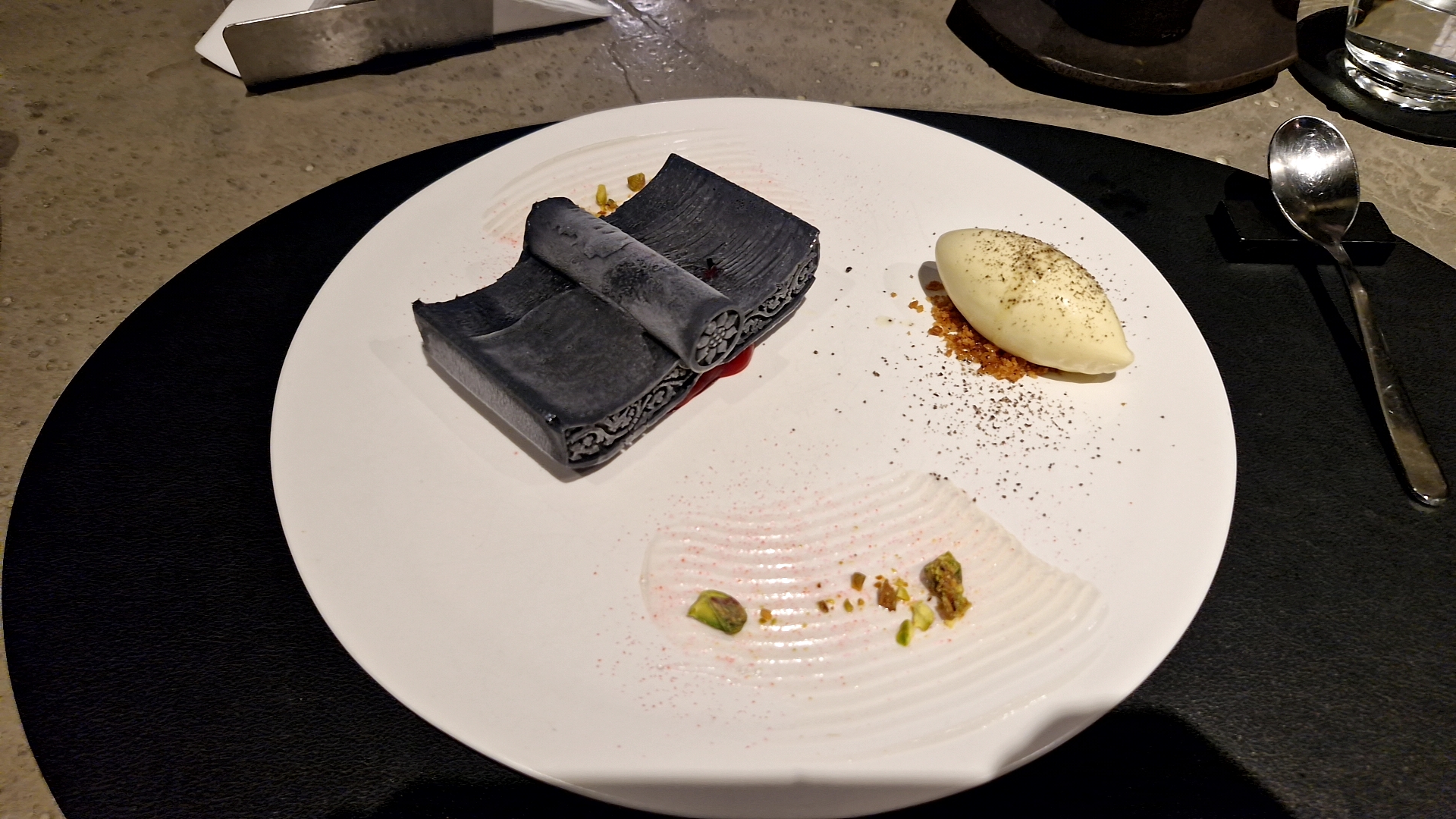 기왓장 아이스크림은... 좀 많이 컸어요. 아이스크림의 질감도 몰드에 넣어서 굳히기 위한 아이스크림 안정성 문제인지는 모르겠는데 식감이 초등학생들이 먹는 점성이 약한 찰흙같은 젤리류?같았습니다. 맛적으로는 뭐 크게 문제 없었지만 식감과 양이 좀 과했던 것 같기는 합니다. 그래도 한식이라는 스토리텔링 적에서 충분히 이해할만 했던 메뉴였던 것 같아요.