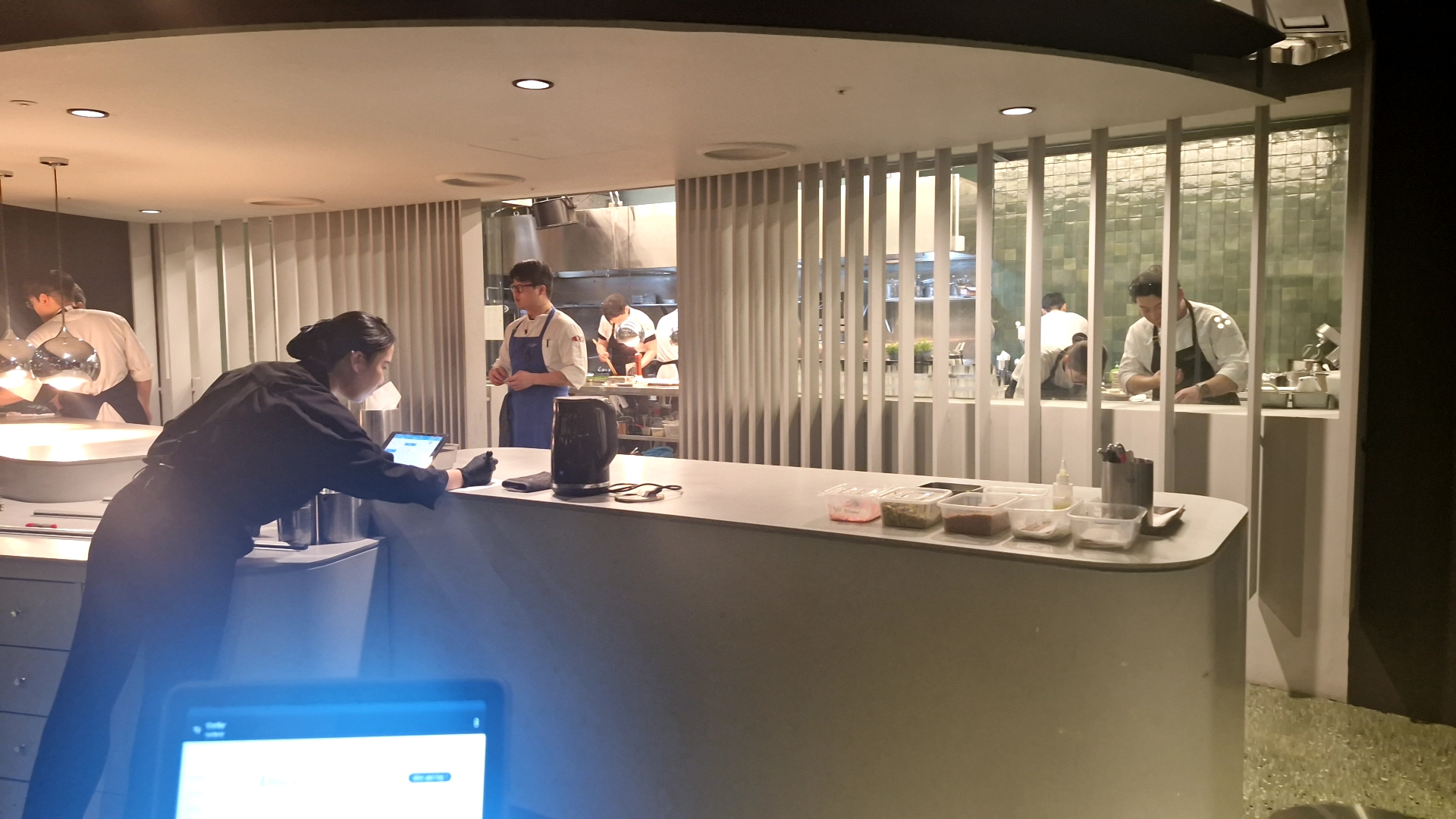 테이블 세팅입니다. 깔끔하게 식기류 모두 준비되어 있었고 젓가락을 사용하시는 분까지 고려해서 준비해둔 센스가 개인적으로 좋았습니다. 앞에 한입을 먹고 닦을 물티슈와 중간에 음식마다 설명이 안내되어 있는 테블릿까지 98,000원 파인다이닝이라고 하기에는 확실히 기본 세팅이 좋았습니다.