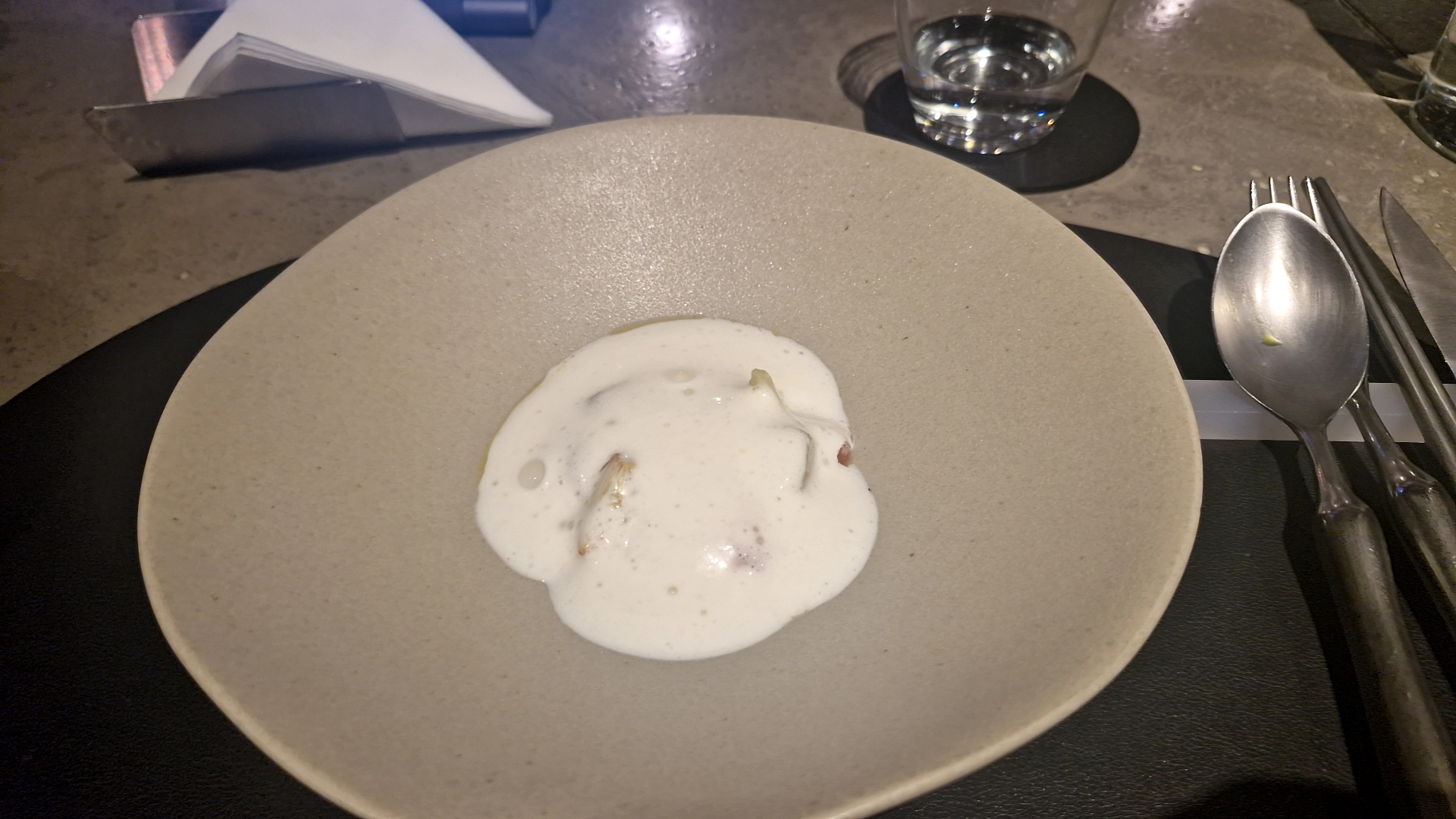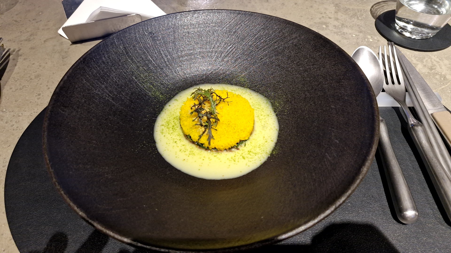 아래에는 토마토, 콜리플라워, 멜론, 샐러리악 등의 재료가 있었고 위에는 우유 두부 폼으로 덮어서 고소하면서 산뜻한 첫 번째 에피타이저였습니다. 생각보다 우유 두부 폼이 갖고 있는 산미가 아래 재료가 잘 안섞였는지 첫입이 예상보다 산미가 강하게 들어왔지만 그래도 전체적으로 맛이 부드럽고 좋았습니다. 의도하신 건지는 모르겠는데 과하게 달지 않은 멜론, 구운 콜리플라워, 샐러리악, 토마토 하나하나 재료 맛이 잘 느껴졌고 산뜻한 스타트였던 것 같아요.