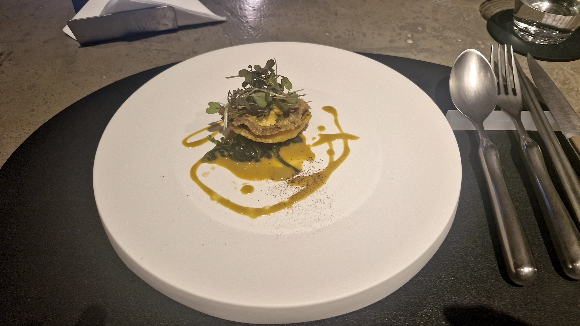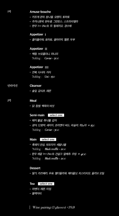 30분 간격으로 매장을 채우는데 첫타임의 손님들은 모두 테이블 간격을 띄워서 배치하는 점, 최근 리뷰에서 봤던 애로사항들(동시시작,늦은 조리시간, 어수선한 직원들 분위기)이 개선되고 있다는 것을 이용하면서 느꼈고 음식적으로도 하나하나 정성이 들어간게 느껴져 좋았습니다. 접시나 플레이팅, 커틀러리 모두 비슷한 가격대의 레스토랑과 비교했을 때 잘 세팅이 되어 있다고 느꼈습니다. 맛은 전반적으로 강도가 강하지 않았고 채소나 버터 치즈 그리고 산미가 주로 많이 활용되는 느낌이 들었습니다. 중간 중간 한식적인 요소를 넣기 위해서 간장, 된장, 삼계, 기왓장, 우엉, 방풍나물, 잡채 등의 스토리텔링도 녹아들어 있었고요.