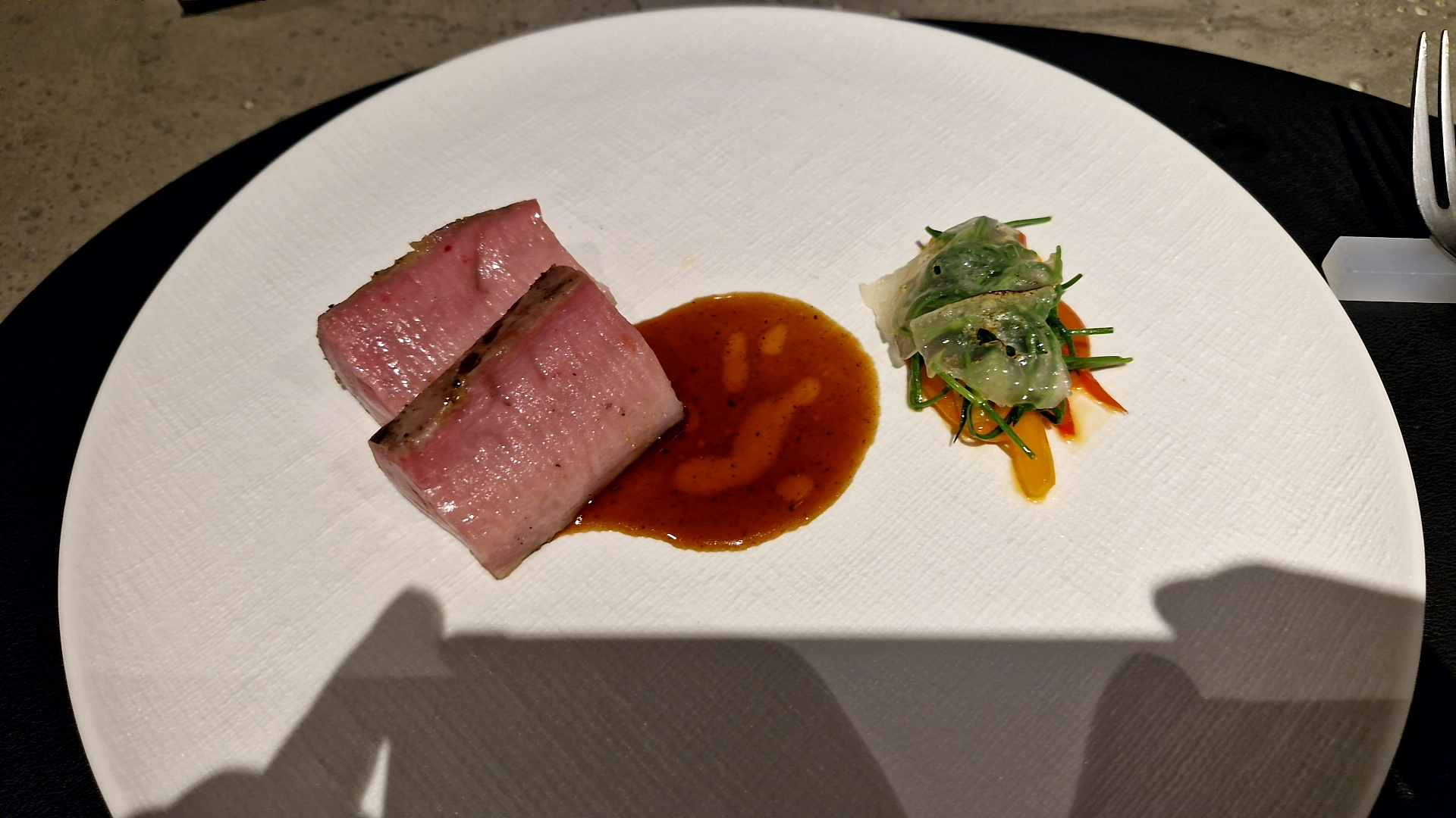 흑돼지 안심은 콩피나 수비드를 한 뒤 된장을 겉에 발라 가볍게 숯에서 구워서 나오는 것 같았습니다. 진한 치킨쥬와 부드러운 돼지 안심은 아주 전형적인 음식 조합이어서 익숙하지만 맛있었습니다.