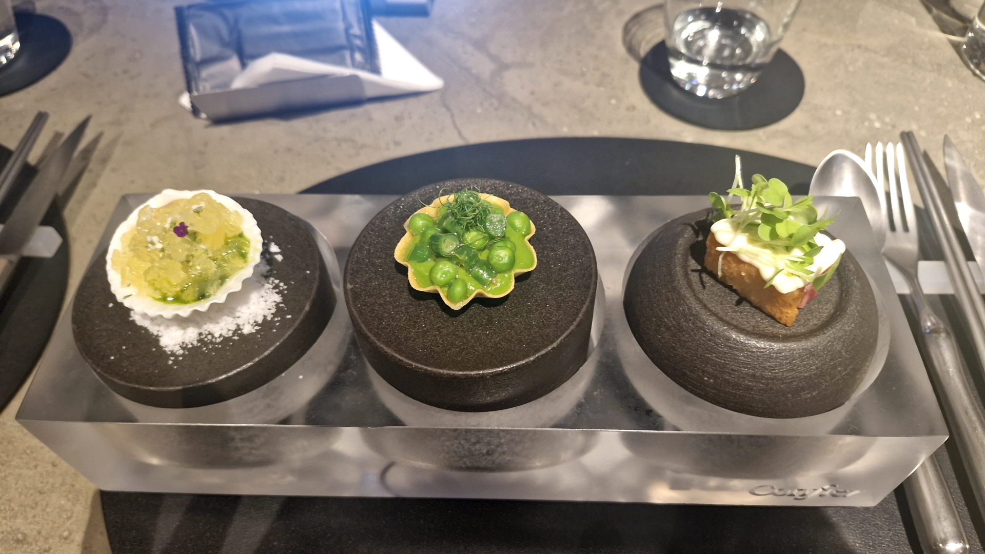 한입요리 3종으로 시작을 합니다.사실 파인다이닝에서 한입요리가 주는 시각적인 임팩트와 맛은 코스를 시작하는 데 있어서 상당히 큰 비중을 차지 합니다. 저도 파인다이닝을 그래도 미쉐린가이드, 미슐랭 레스토랑들을 먹으러 다녀보고 근무를 해본 입장에서는 콘피에르의 한입요리는 맛적으로나 비쥬얼적으로나 사실 임팩트가 있지는 않았습니다. 채소, 해산물, 육류라는 재료적인 측면에서는 밸런스가 맞았으나 한입 요리들간의 색감이나 플레이팅적인 부분, 그리고 맛적인 부분에서는 밸런스가 맞지 않았다고 생각합니다.
