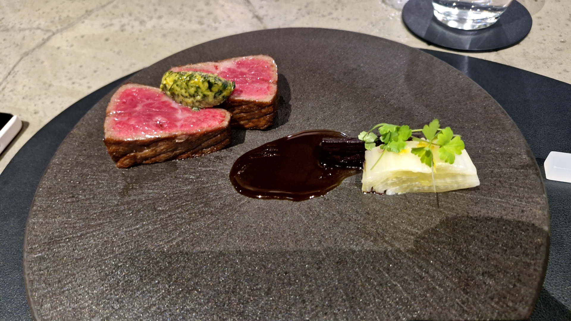 추가로 주문한 한우 채끝입니다. 위에 올라간 방풍나물, 살구페스토, 중간에는 우엉 글레이즈가 있었습니다.