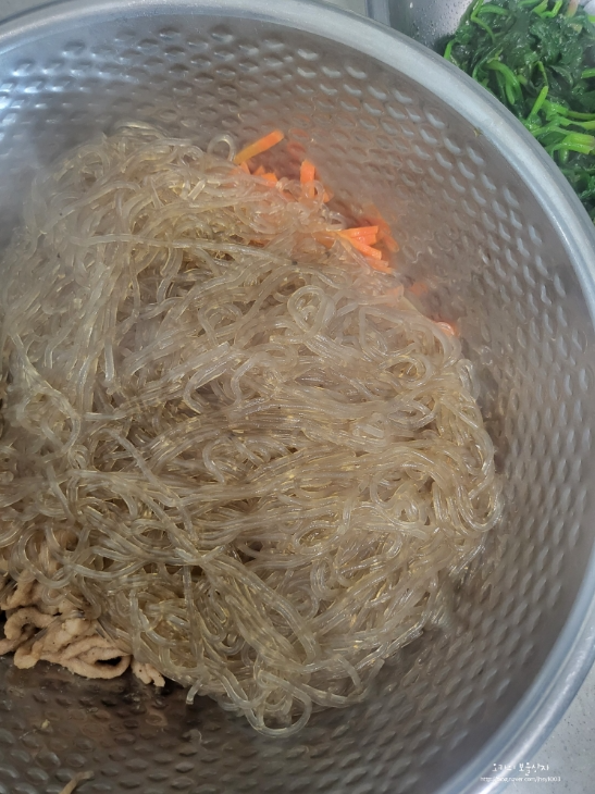 - 2.5L의 끓는 물에 당면을 넣고 3분간 삶는다. 그리고 빠르게 찬물로 헹구고 물기를 제거한 후 믹싱볼에 옮겨 담자.