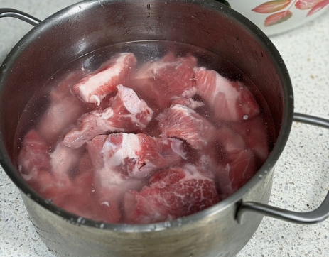 - 핏물이 빠지면, 끓는 물에 콜라와 돼지갈비를 넣고 5분 정도 데쳐 불순물을 제거하고 찬물에 헹궈줍니다.